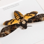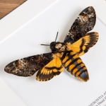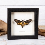 An amazing framed Death's Head moth, in your choice of black or white wood. Mounted on high-quality acid-free conservation board. The Latin and common names are printed underneath the specimen.