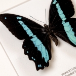 A Green-banded Swallowtail butterfly in a handmade wooden frame mounted on high-quality acid-free conservation board. The Latin and common names are printed underneath the specimen.