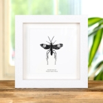 A Pepsine Spider Wasp in a handmade wooden frame mounted on high-quality acid-free conservation board. The Latin and common name are printed underneath the specimen.