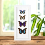 An Agrias butterfly Trio in a handmade wooden frame mounted on high-quality acid-free conservation board. The Latin and common names are printed underneath the specimen.