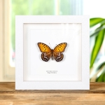 A Speyeria idalia in a handmade wooden frame mounted on high-quality acid-free conservation board. The Latin and common names are printed underneath the specimen.