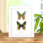 A pair of stunning Madagascan sunset moths in a handmade wooden frame mounted on high-quality acid-free conservation board. The Latin and common names are printed underneath the specimen.