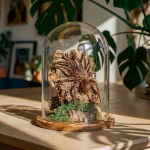 A beautiful Giant Forest Scorpion mounted on a piece of wood displayed in a handmade glass dome with your choice of black or brown wooden base.