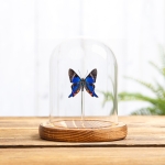 A The Periander Metalmark in a handmade glass dome with your choice of brown or black wooden base. All of our domes / bell jars are handmade with fine detail in the UK meaning we have full control over the process.