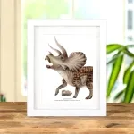 A Triceratops in a handmade wooden frame mounted on high-quality acid-free conservation board. The Latin and common names are printed underneath the specimen.