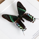 A beautiful Urania leilus Swallowtail moth in a handmade wooden frame mounted on high-quality acid-free conservation board. The Latin and common names are printed underneath the specimen.