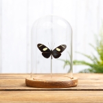 A Wallace's Longwing in a handmade glass dome with your choice of brown or black wooden base. All of our domes / bell jars are handmade with fine detail in the UK meaning we have full control over the process.