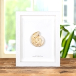 A White Spine Whole Ammonite Fossil in a handmade wooden frame mounted on high-quality backing board. Common and Latin names are printed underneath.